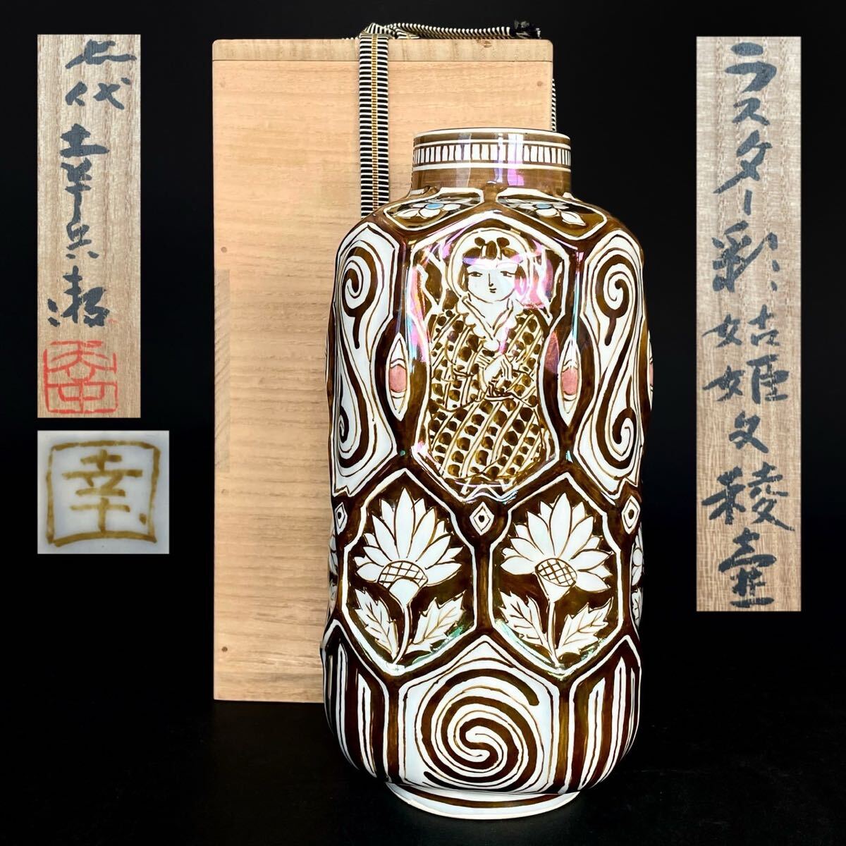> 七代 加藤幸兵衛 ラスター彩姑姫文稜壷 飾り壷 花瓶 共箱 栞 高さ約26cm(8b080885 2)