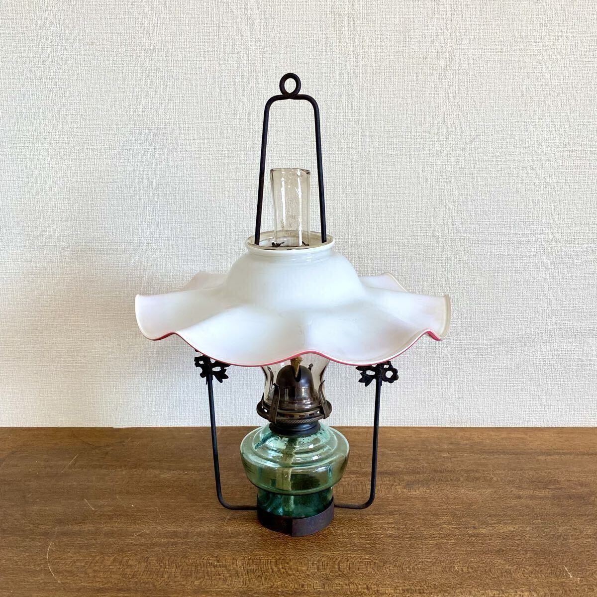- アンティーク オイルランプ 吊りランプ / フリル型 ピンク色縁笠 洋燈 古道具 大正ロマン 当時物