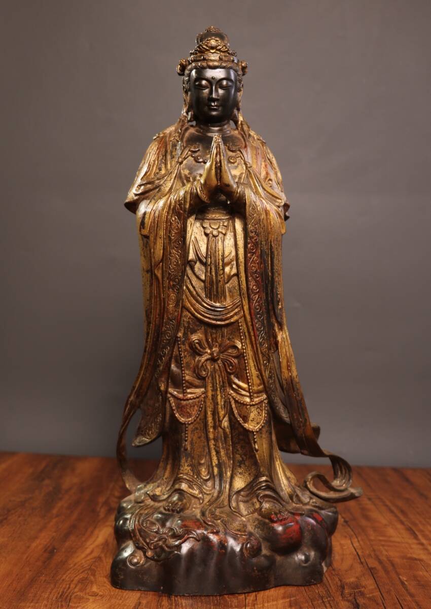 - 古銅 仏像 清時代 純銅 蒔絵朱砂仏像 観音菩薩全像 置物 立像 古物保証 銅製 神獣 置物 旧家整理品 中国古美術 子供置物 821