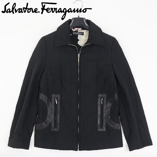 - 【HA11】◆Salvatore Ferragamo サルヴァトーレ フェラガモ 裏地花柄 レザー使い ガンチーニモチーフ キルティング ジャケット 黒 ブラック