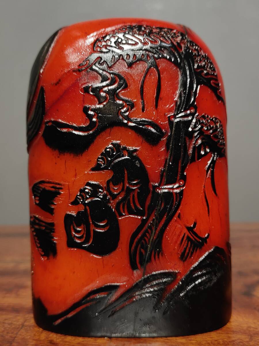 - 時代旧蔵 紅田黄 薄意印鑑 松下二老 閑章置物 印章 時代古玉細密細工★古置物★古賞物★古擺件★蒐集家放出★唐物821