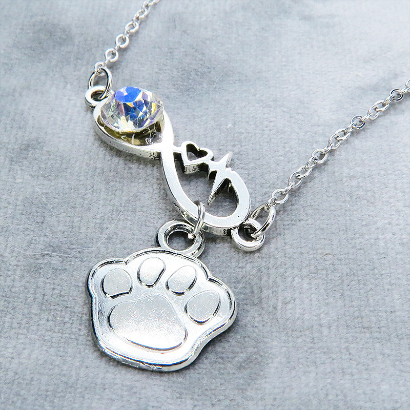 - シルバーカラー クリスタル(クリア)のエターニティーと肉球モチーフを組合せたネックレス ステンレス可 長さ調整可