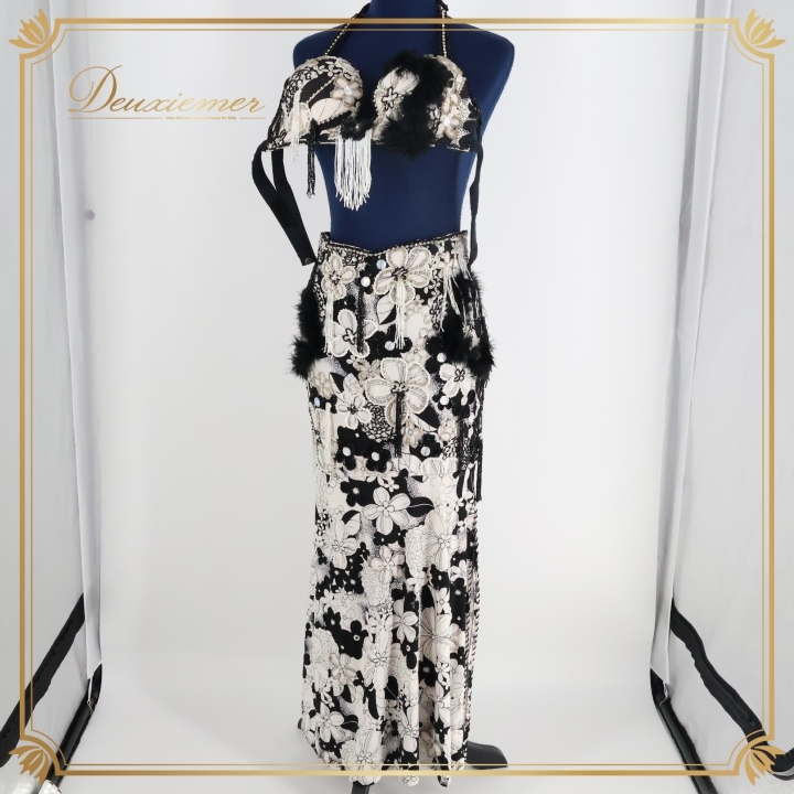 - ベリーダンス オリエンタル 衣装 上下セット 黒 白 Disain Azez ビーズ ラインストーン 花柄 ファー ラメ ホワイト系 ブラック系 イベント