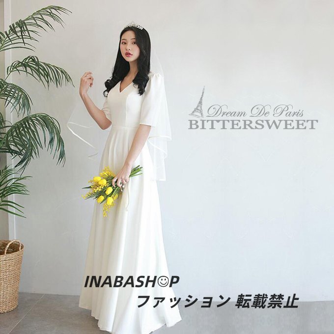 > ウェディングドレス ワンピースウェディングドレス 半袖 Vネック ウエディングドレス ドレススレンダーラインロング 結婚式 海外挙式ドレス