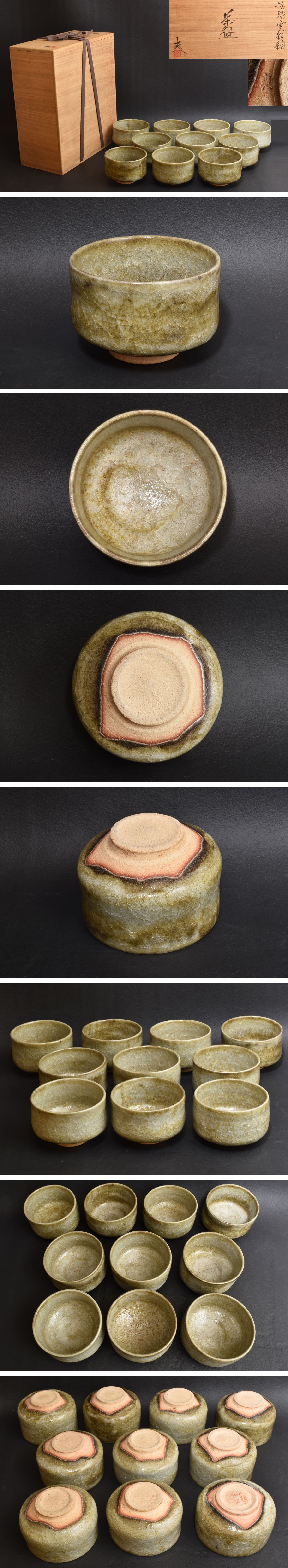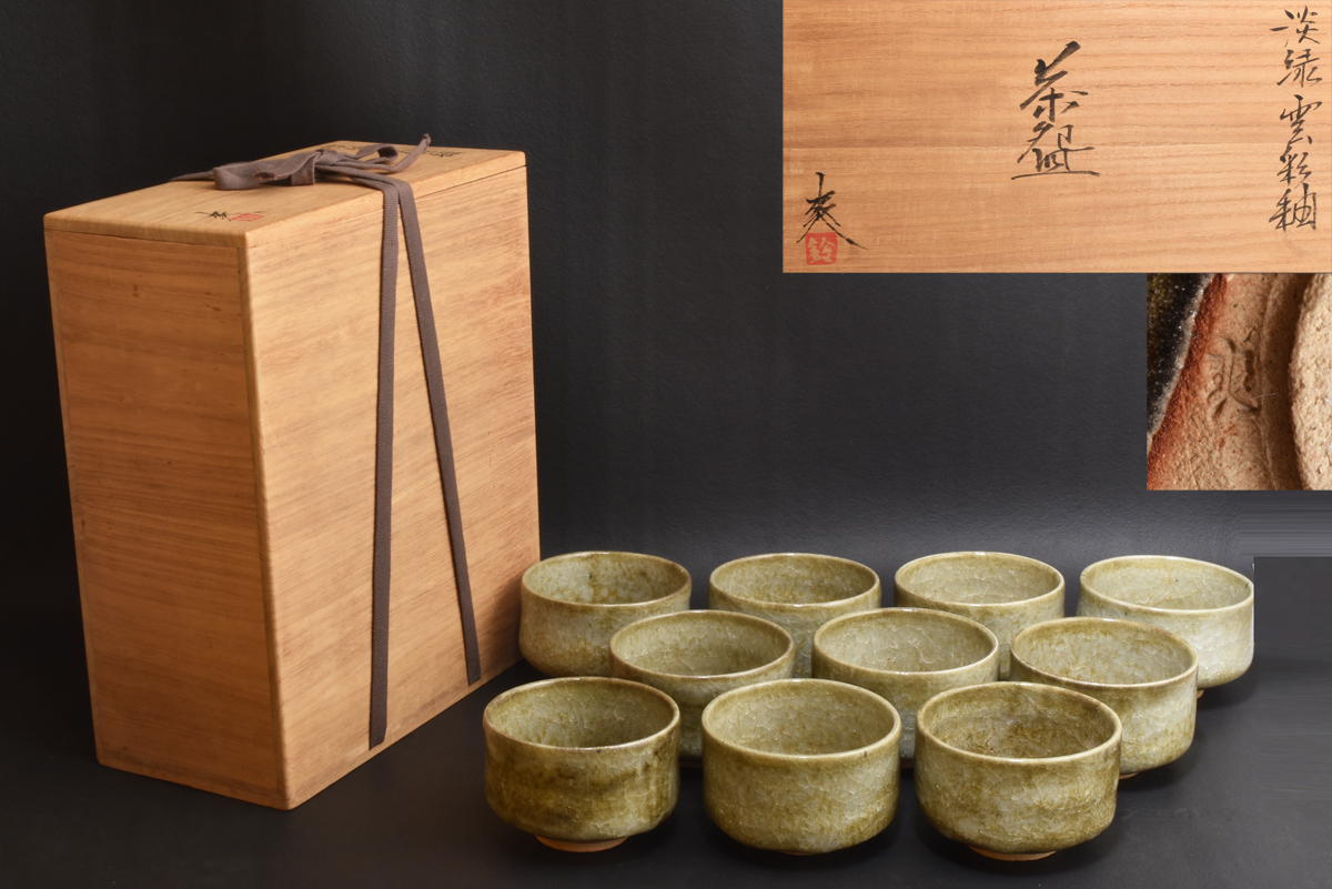 - 5957 鈴木爽司 淡緑雲彩釉 数茶碗 10客 無キズ 共箱