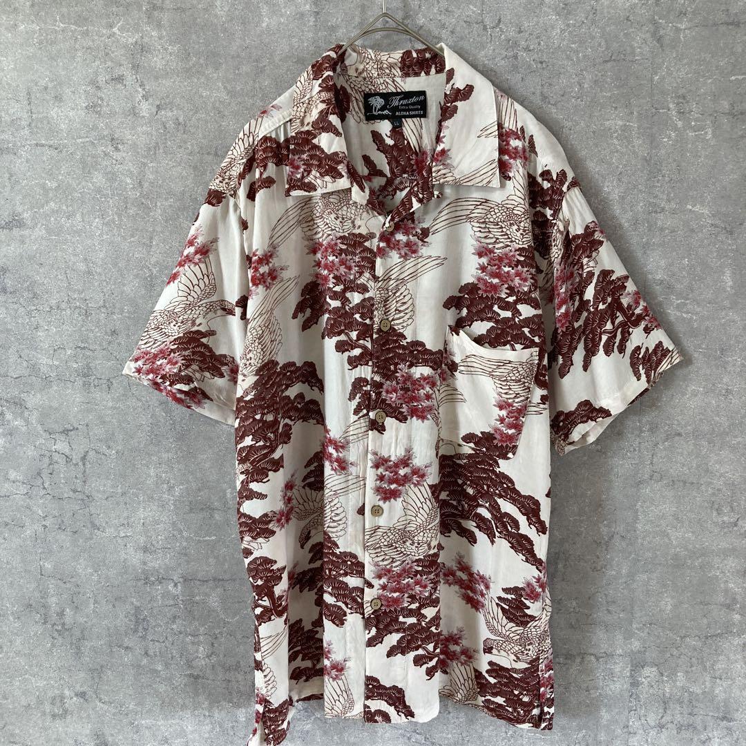 - 和柄 アロハシャツ 松 鶴 総柄 オープンカラーシャツ LL 半袖 コルクボタン