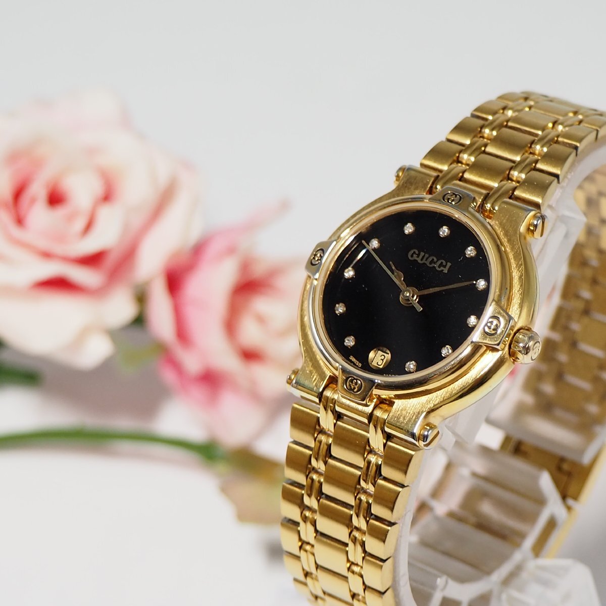 ★★★★ 美品 グッチ GUCCI 9200L 黒文字盤 デイト 11Pダイヤ レディース 腕時計 H213 中古★★★★