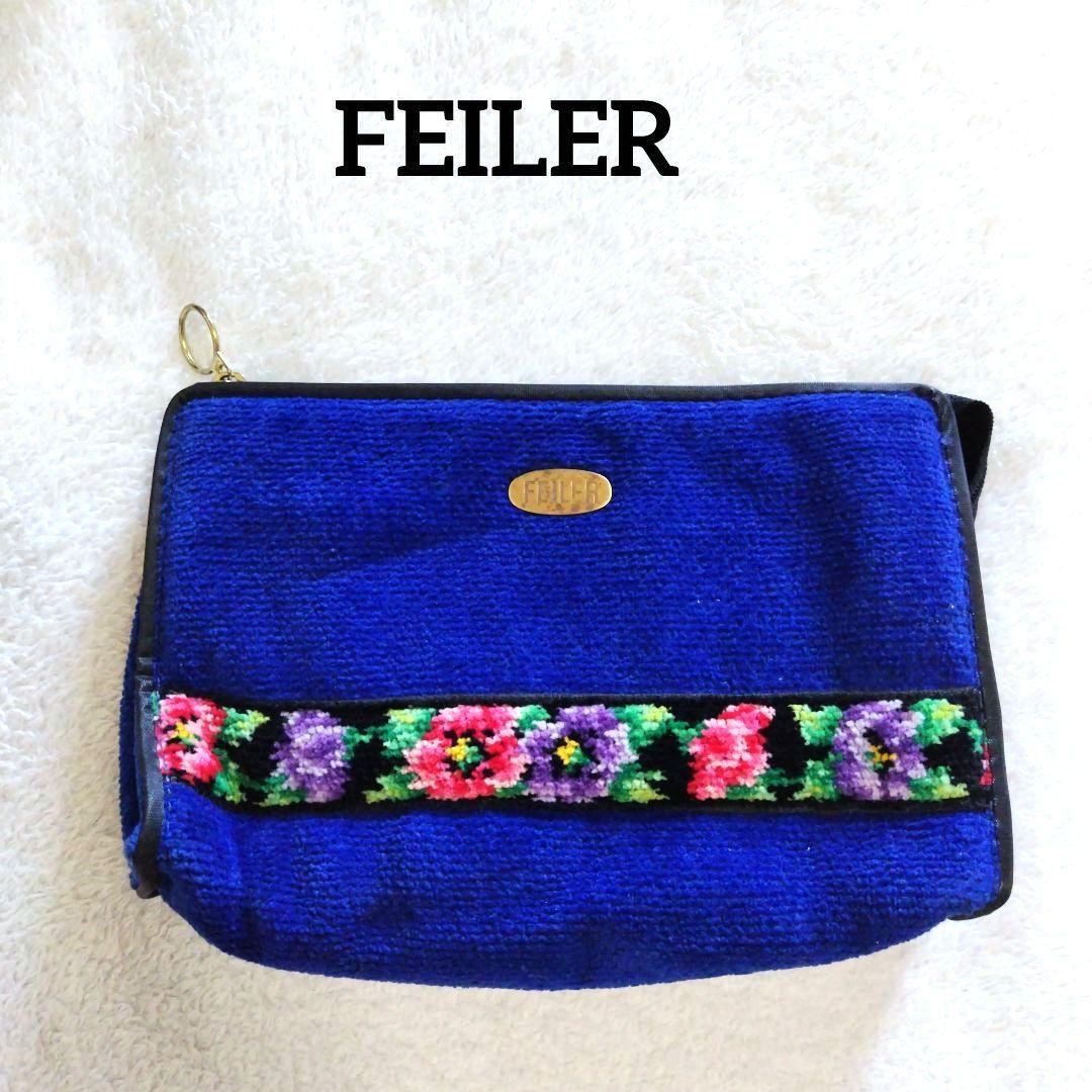 - FEILER フェイラー ポーチ シュニール織り アネモネ ノアーズ 花柄 ゴールド金具 青 ブルー シェニール マルチケース バッグインバッグ