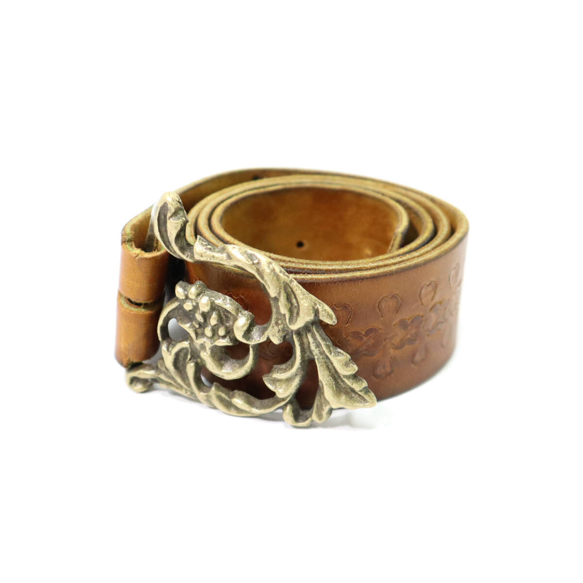 - 一点物 70s ビンテージ レザー カービング ベルト 花柄 SOLID BRASS バックル ソリッドブラス 古着 ヒッピー 型押し本革 茶色 ハンドメイド