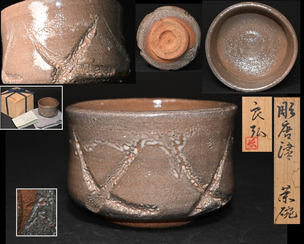 > 真贋保証■西岡良弘 作■ 彫唐津 茶碗 共箱・共布・栞付 父は西岡小十 茶道具 茶器 抹茶茶碗 唐津焼 佐賀県唐津市生
