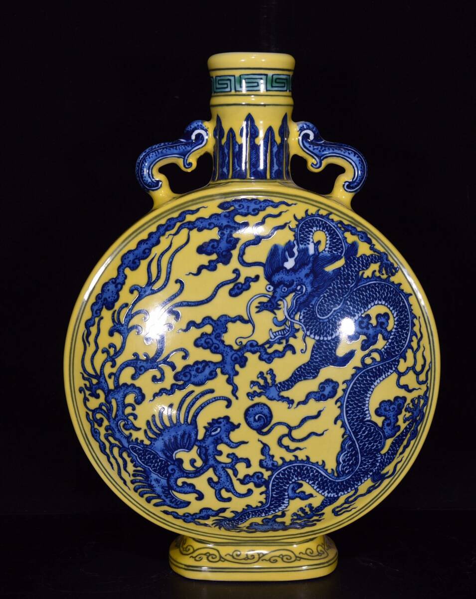 - LB109■大清乾隆年制製 黄地青花龍鳳凰紋扁瓶 珍品 時代物 古玩 唐物 古陶磁器■