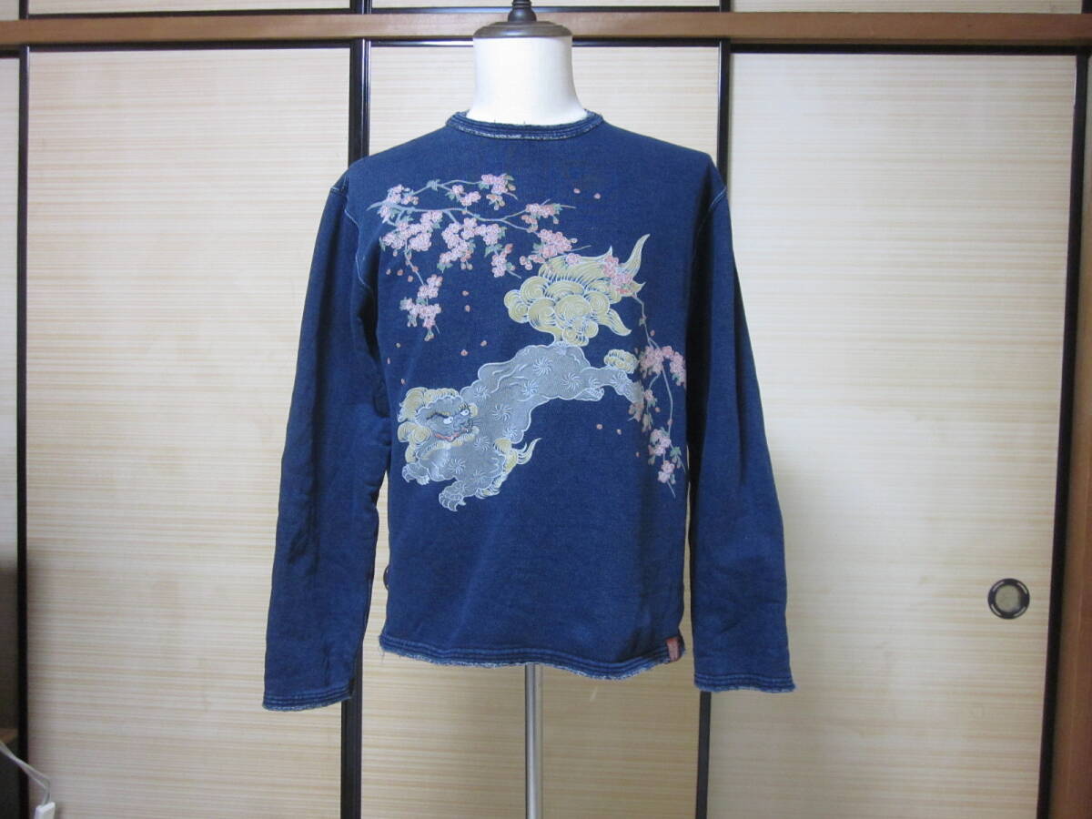 > ☆☆☆【 9/22・大幅値下げ 】「倉」ETERNAL エターナル 倉敷:藍染め風スウェット:唐獅子デザイン画:マエノ(株):サイズ表 M:送料無料