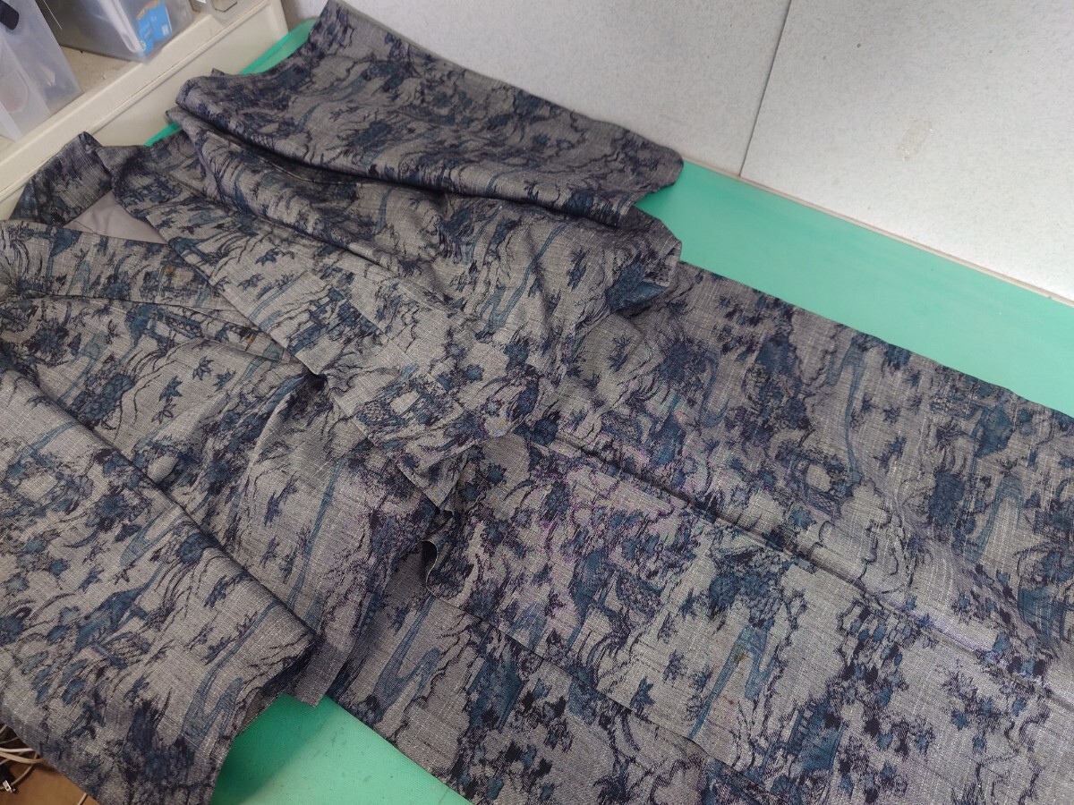 > ●144 粋でカッコイイ 紬 山景 水景 風景 雲 川 花 紅葉 グレー地 和ブルー 黒 着物 中古 汚れあり ①