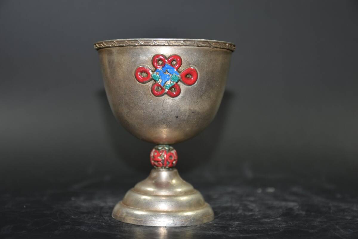 - 【超珍館蔵】白銅製 景泰藍 琺瑯彩 中国經酒杯 置物 賞物 古賞物 古董品 古美術品 時代物 旧家蔵出 稀少珍蔵品