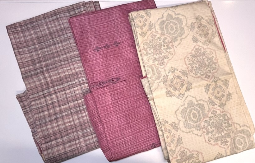 > 花とら●リサイクル着物 紬 3枚まとめて ピンク 格子 薄黄 リメイク 素材 細工用 250810