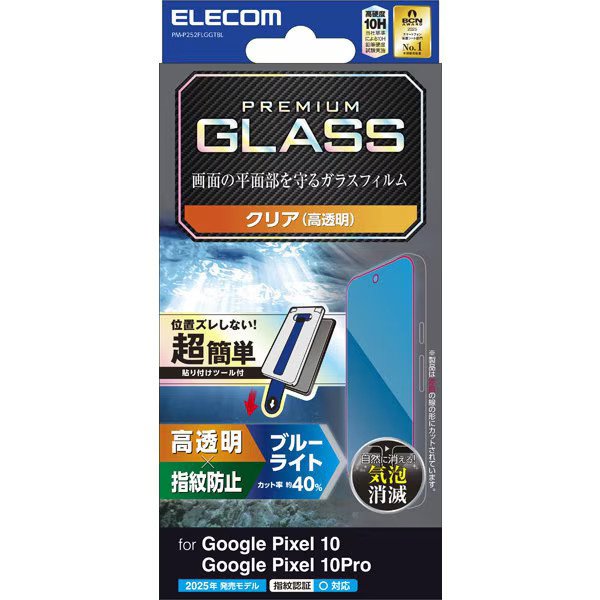 > Google Pixel 10/10 Pro用画面保護ガラスフィルム 正確な位置に貼れる超簡単貼り付けツール付 ブルーライトカットタイプ: PM-P252FLGGTBL