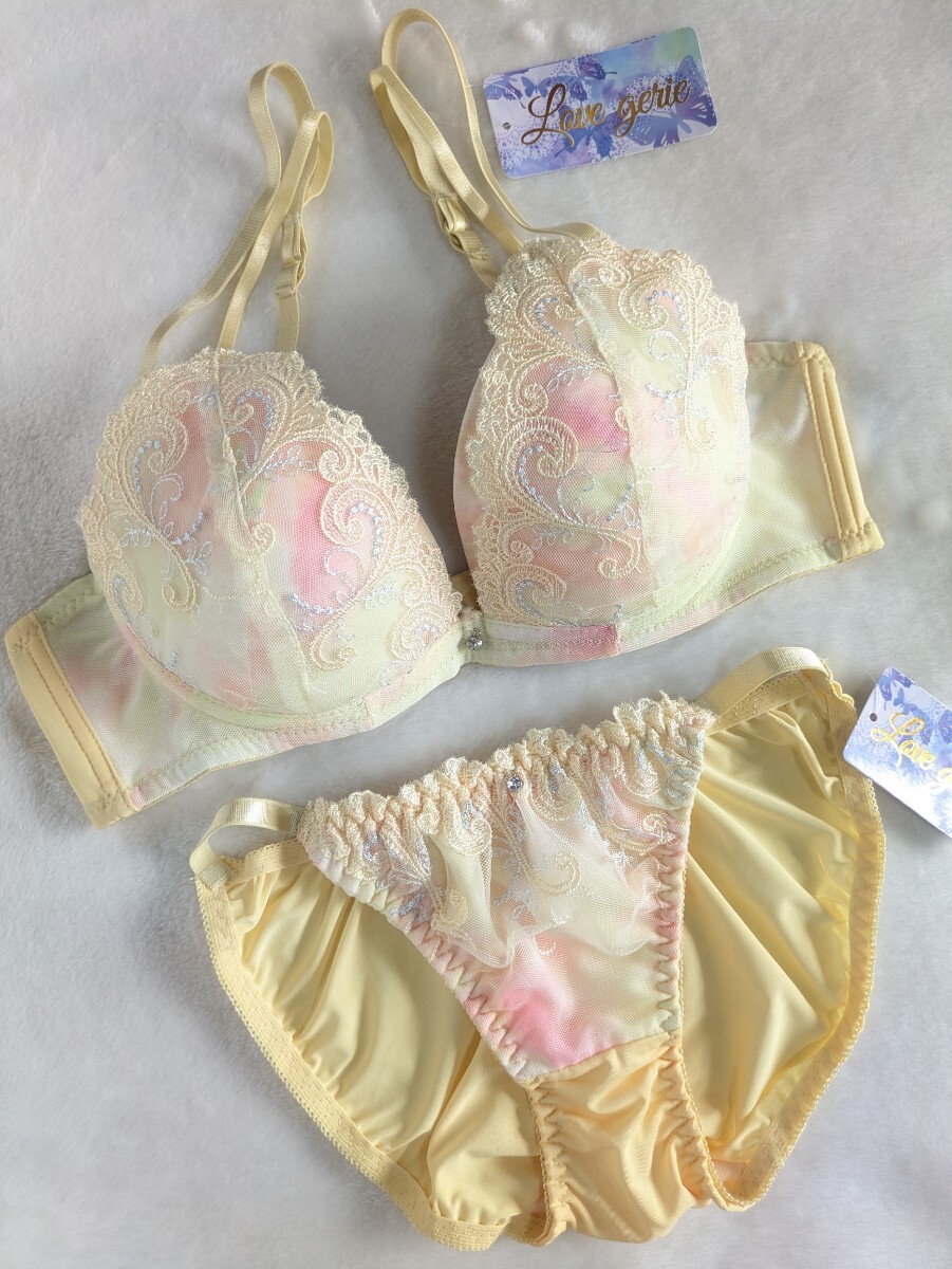 > お泊まりに☆D70ブラ&パンティ上下お揃い☆未使用☆きれいレース☆胸元ストラップ&サイドストリング☆イエロー☆匿名配送可☆タグあり☆