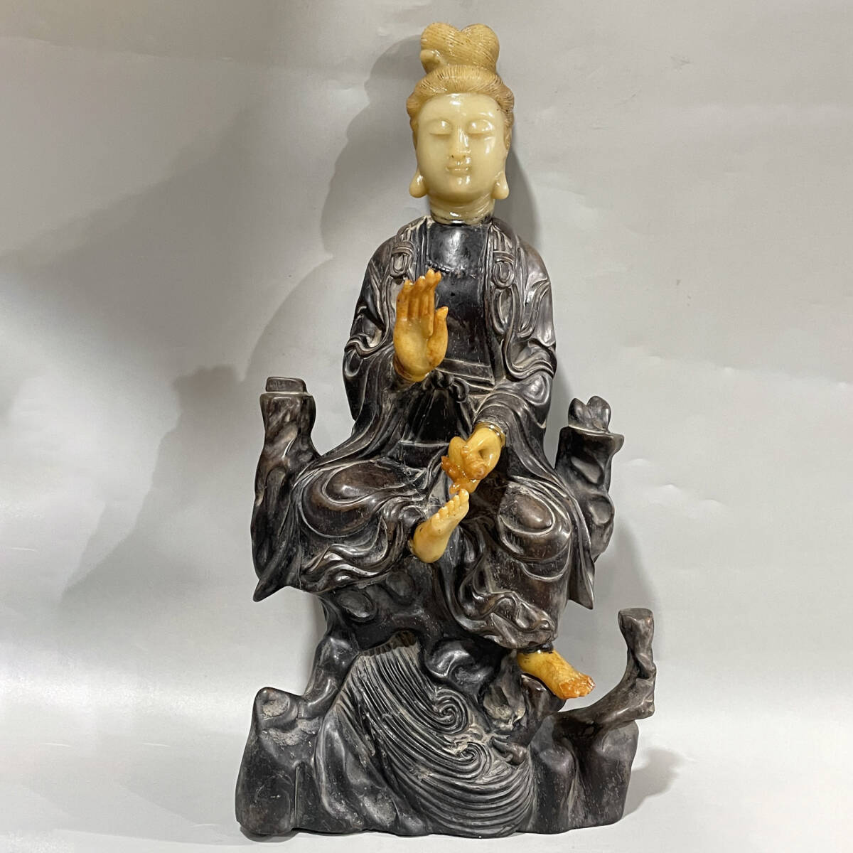 - 8+GV1958「東洋美術」 人間国宝 骨董 木製 工芸品 木彫り 時代物 賞物 【白檀と天黄石を象嵌した観音像】 書道具 文房具 収蔵価値が高い