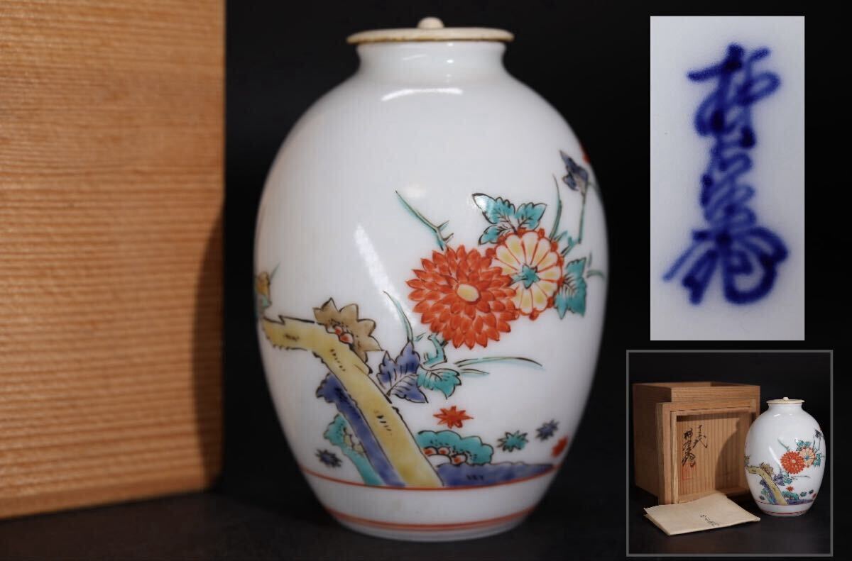 - 十三代 酒井田柿右衛門 作 錦 草花文 茶入 栞・共箱付 / 有田 名工 人間国宝 色絵 茶器 煎茶道具 .G2384