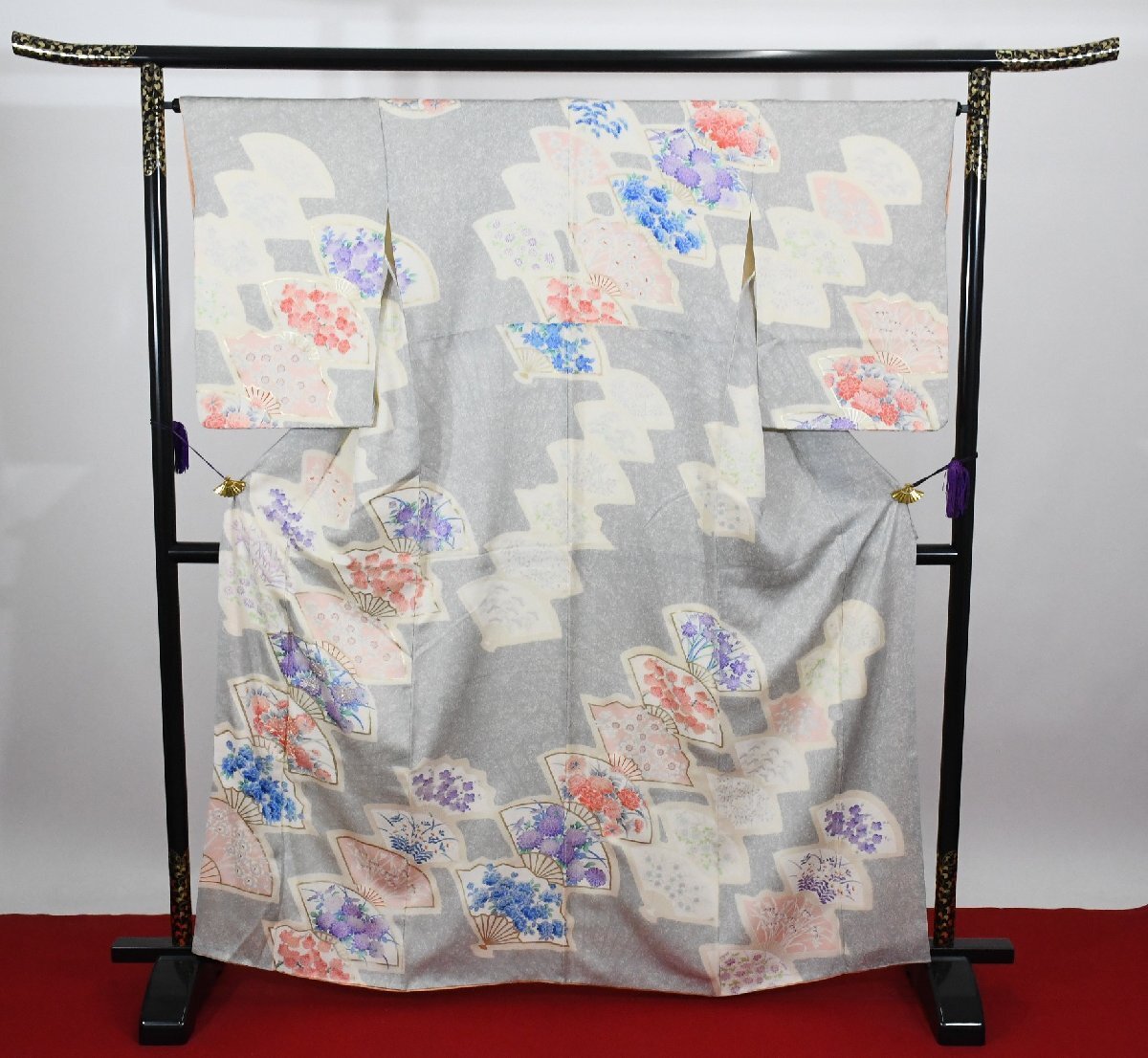 > 小紋 着物 袷 扇子金彩 杜若 梅 花 身丈156cm 裄丈65cm ★ kb-6976 桜庭呉服店