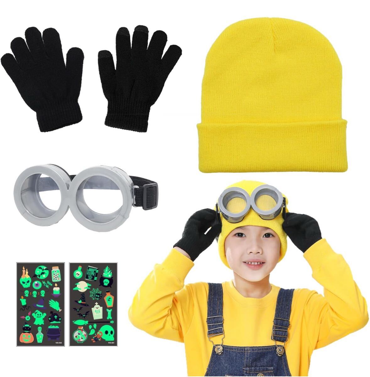 - ハロウィン ミニオン コスプレ 仮装 子供【黄色いニット帽 ゴーグル 手袋 ハロウィン専用蓄光タトゥーシール 5点セット】ミニオン用 仮装