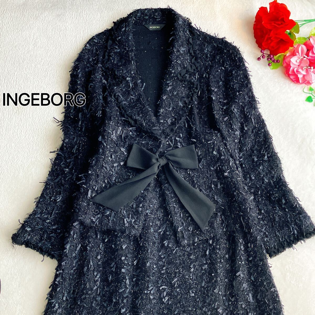 - INGEBORG インゲボルグ★フリンジ フリル リボン スカートスーツ Aライン オケージョン ラメ ブラック【美品】