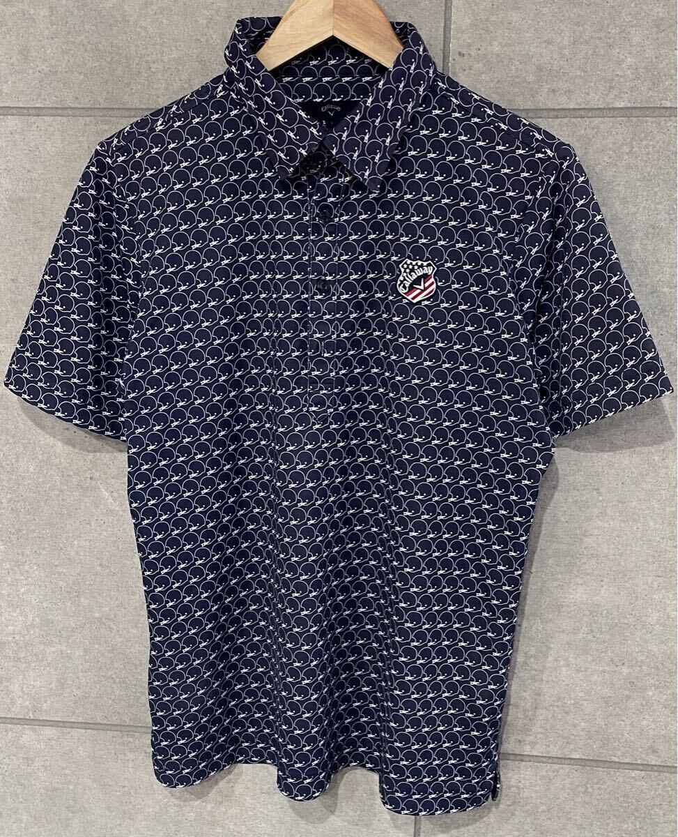 - 希少デザイン! Callaway キャロウェイ 吸汗速乾 半袖ポロシャツ 総柄 星条旗ワッペン ネイビー Lサイズ ウェア レターパック可 ○ 新規×