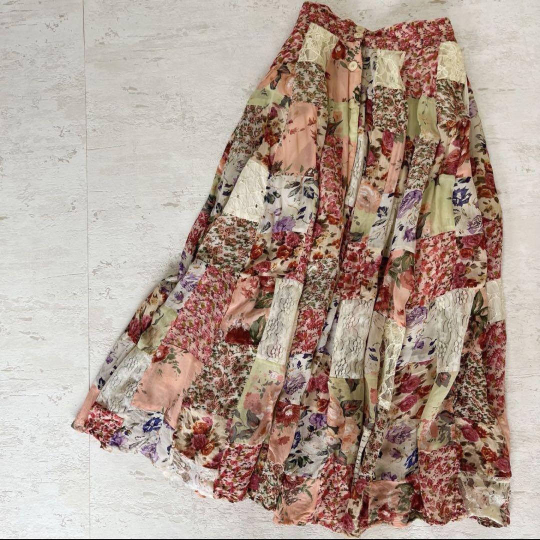 - 昭和レトロ ヴィンテージ 花柄 パッチワーク フレア ロング丈 ボヘミアン ac