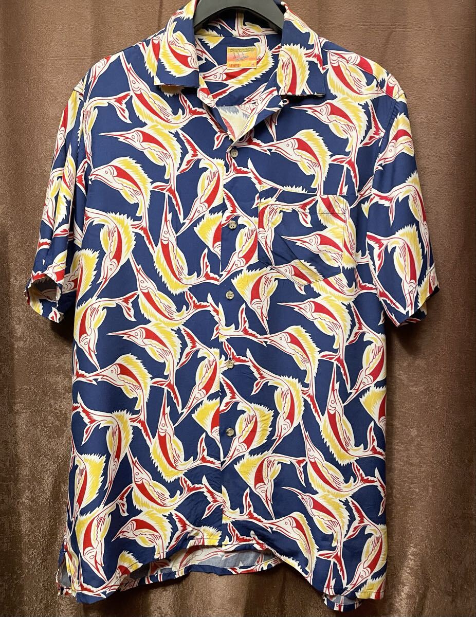 > レア MADE IN JAPAN製 90s LEVI'S bahama 半袖 魚柄 アロハシャツ ブルー Mサイズ リーバイス バハマ 日本製 半袖シャツ 開襟シャツ 青
