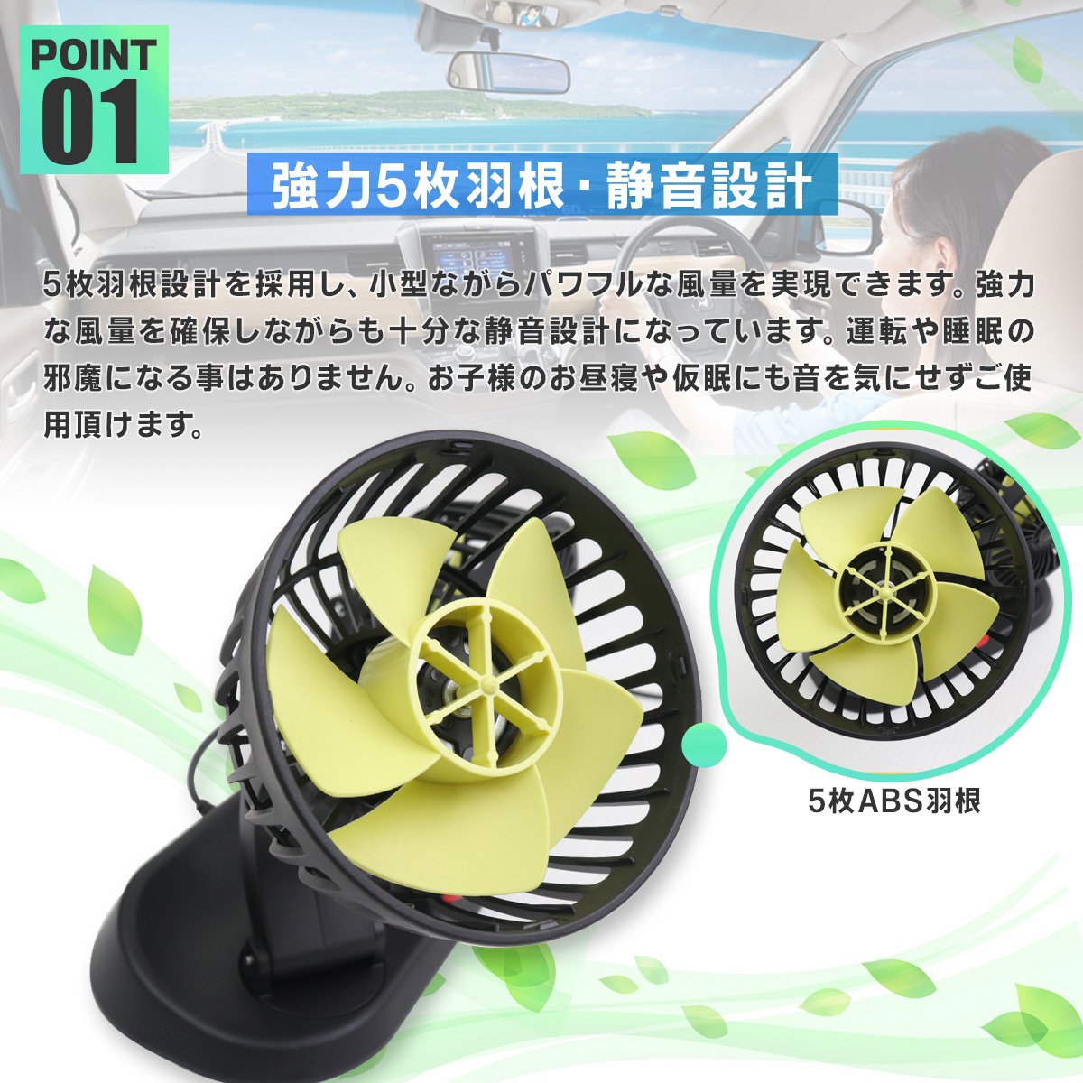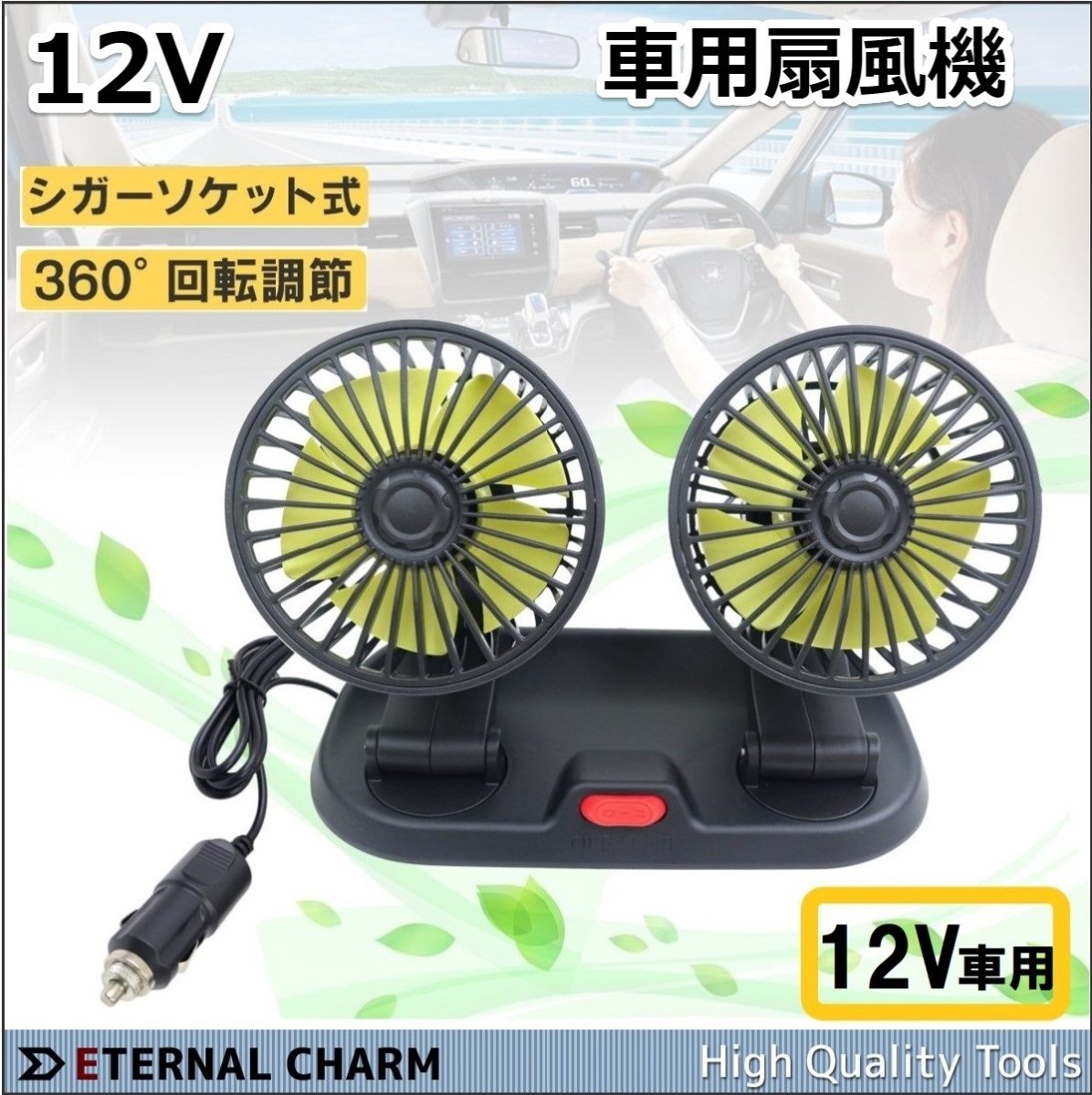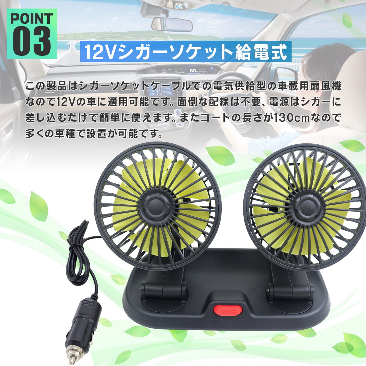 - 【送料無料】12V 車載小型扇風機 ツインファン 両頭送風 12V シガーソケット充電 360° 回転 5枚羽根 2段風量調節