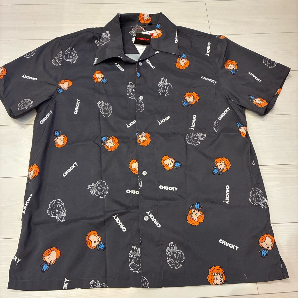 - 新品未使用チャイルドプレイ チャッキー オープンカラーシャツ アロハシャツ 総柄 半袖 ムービー キャラクター アメカジ グレー