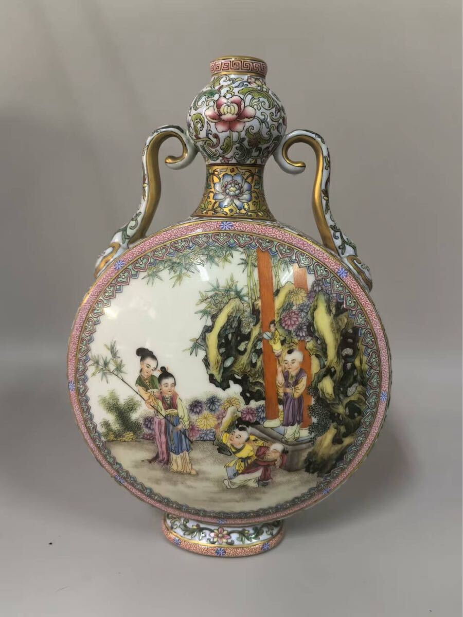 - 【竹河】中国古美術 清時代 粉彩 琺瑯彩 抱月瓶 花瓶 双耳 時代物 唐物 古玩 骨董 藏出 置物 骨董品 当時物 置物 中国磁器