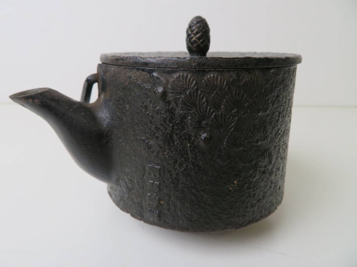- ▽南部鉄器 南部鉄瓶 銘あり 鉄瓶 急須 茶器 松 松ぼっくり掴み 伝統工芸 茶こし付き