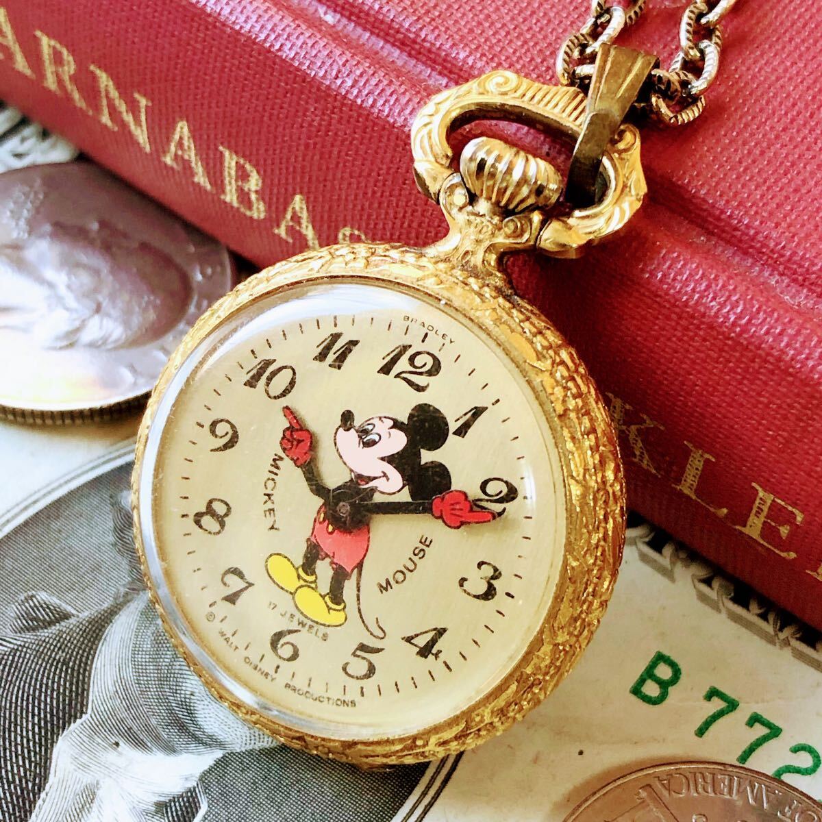 - #3720【超可愛い】懐中時計 ミッキーマウス 機械式 手巻き 動作品 1970年代 アンティーク ヴィンテージ MICKEY MOUCE 17石 チェーン付