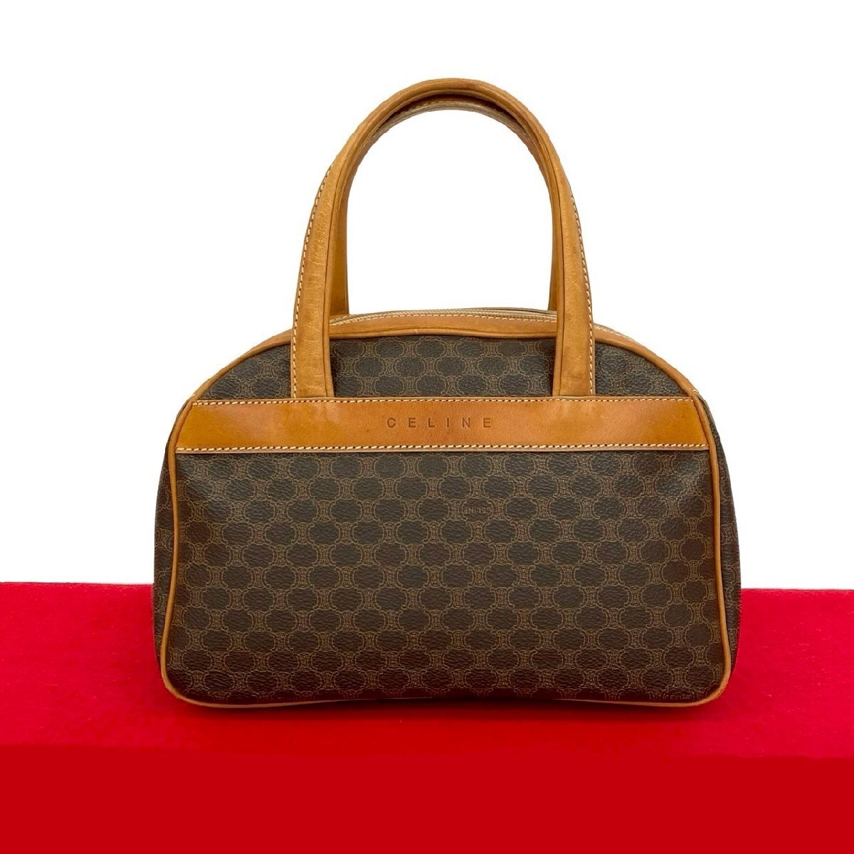 - 極 美品 CELINE セリーヌ ヴィンテージ マカダム ブラゾン 柄 ロゴ レザー 本革 ハンドバッグ ミニ ボストンバッグ ブラウン 41441