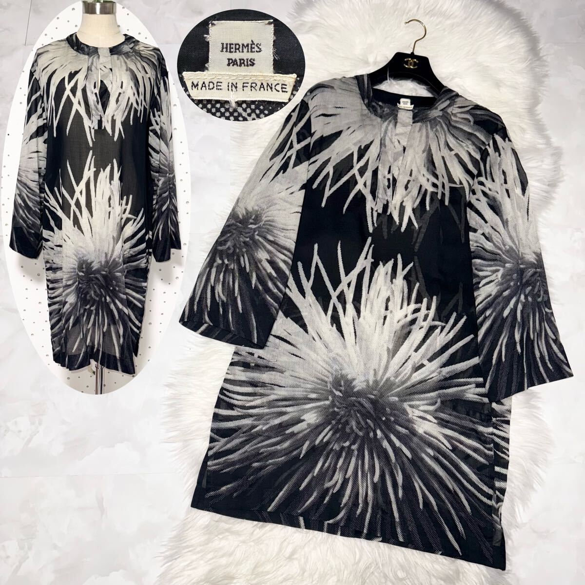 > 本物 美品 エルメス 花柄 フラワーデザイン 100%コットン 七分袖 八分袖 プルオーバー ワンピース ドレス 36 ブラック×グレー系 HERMES