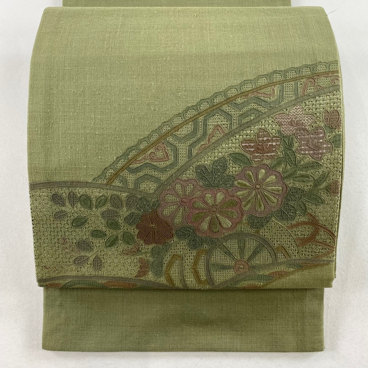 - 袋帯 美品 秀品 紬地 花車 毘沙門亀甲 刺繍 灰緑 お太鼓柄 正絹 【中古】