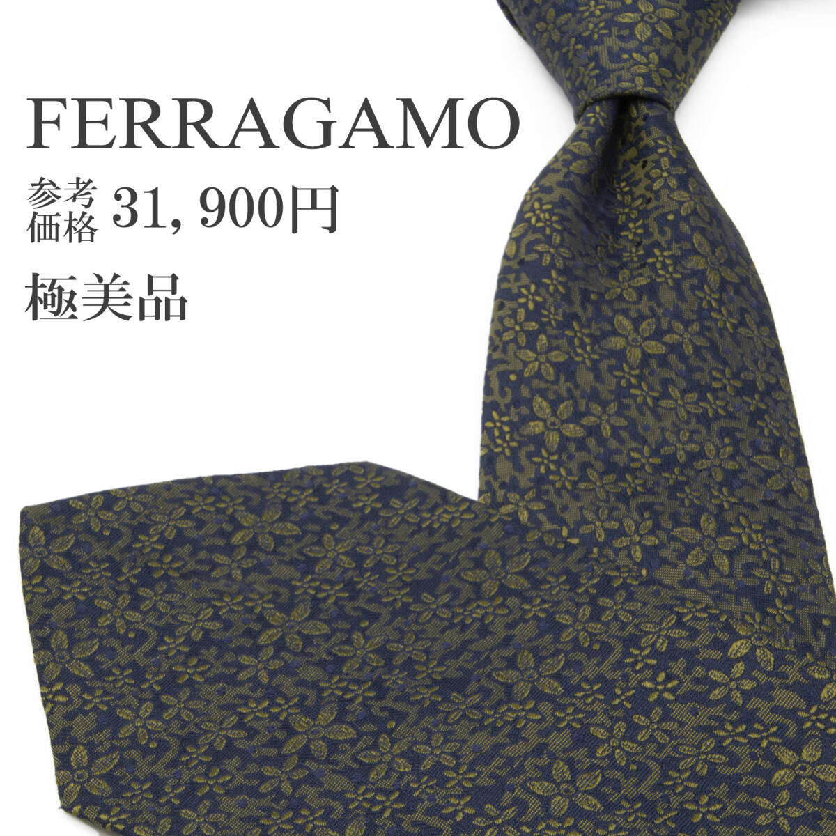 > 送料無料 フェラガモ ネクタイ ジャガードタイ メンズ シルク 緑 グリーン 青 紺色 ネイビーブルー Y2K 90's 00's 光沢 花 ブランド P449
