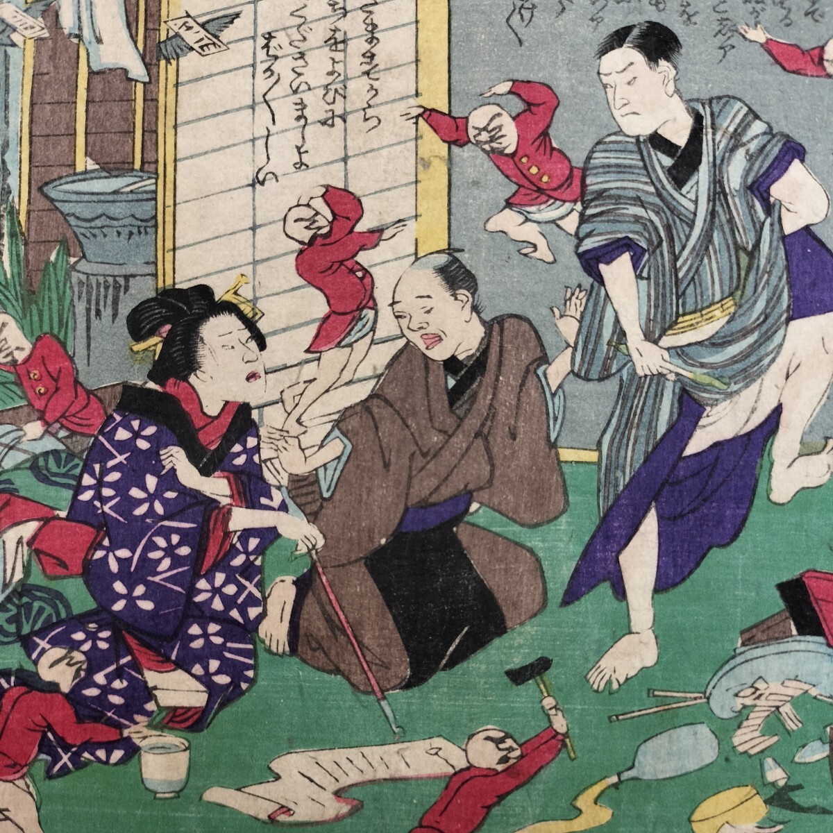- 面白い戯画!明治期/真作 昇斎一景「教訓善悪鏡 悪 五」本物浮世絵木版画 諷刺画 錦絵 中判 裏打ち