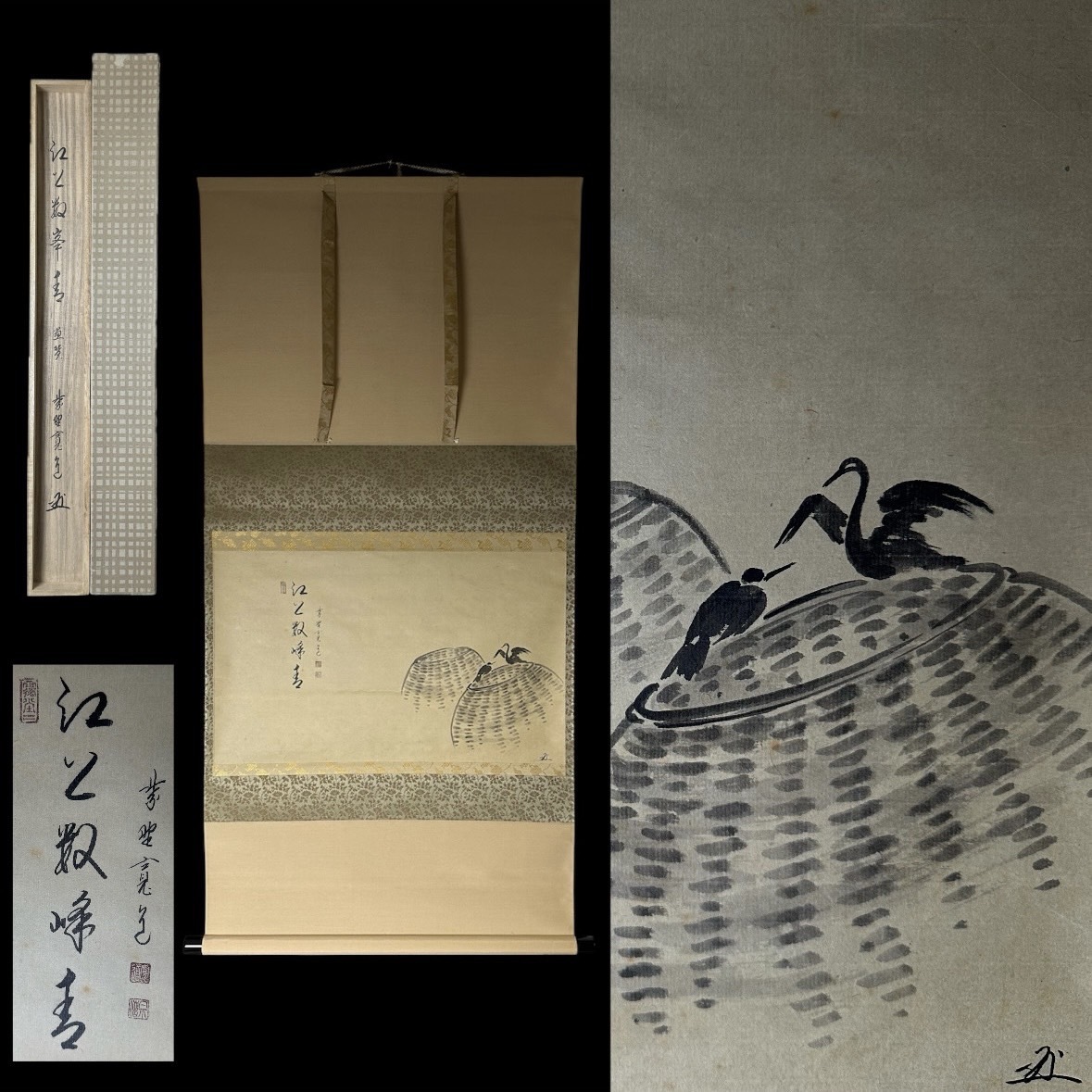 - コレクター買取品 掛軸 水墨画 真雁図 鳥文 二羽 在銘 落款 共箱 二重箱 紙本 肉筆 時代物