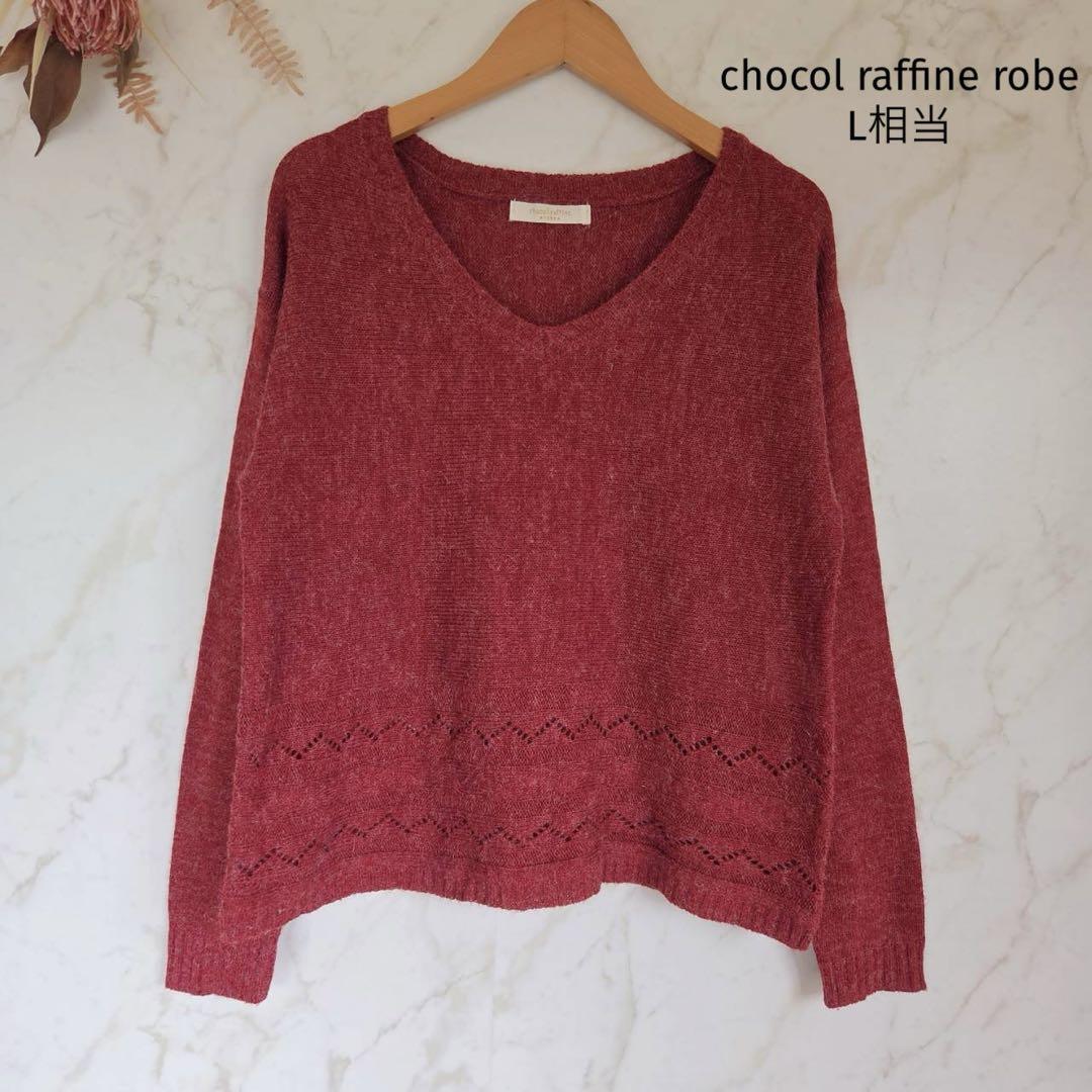 - 美品ショコラフィネローブ ニット L相当 モヘヤ風 Vネック 長袖 赤茶系