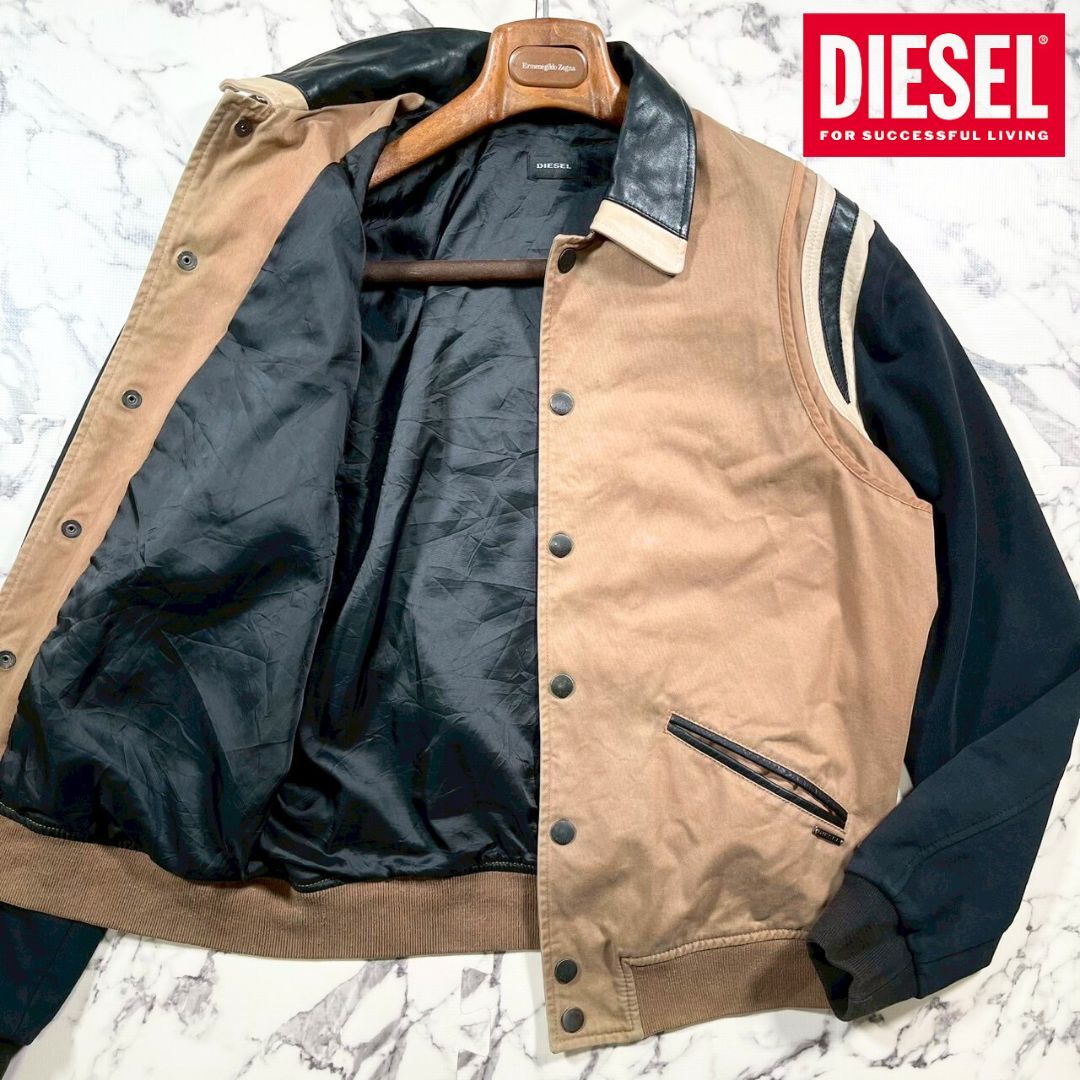 > 美品/レザー切替(L)●DIESEL スタジャン 袖スウェット生地 本革 コットン ブルゾン キャメル ブラック 黒白 ドッキング ディーゼル メンズ