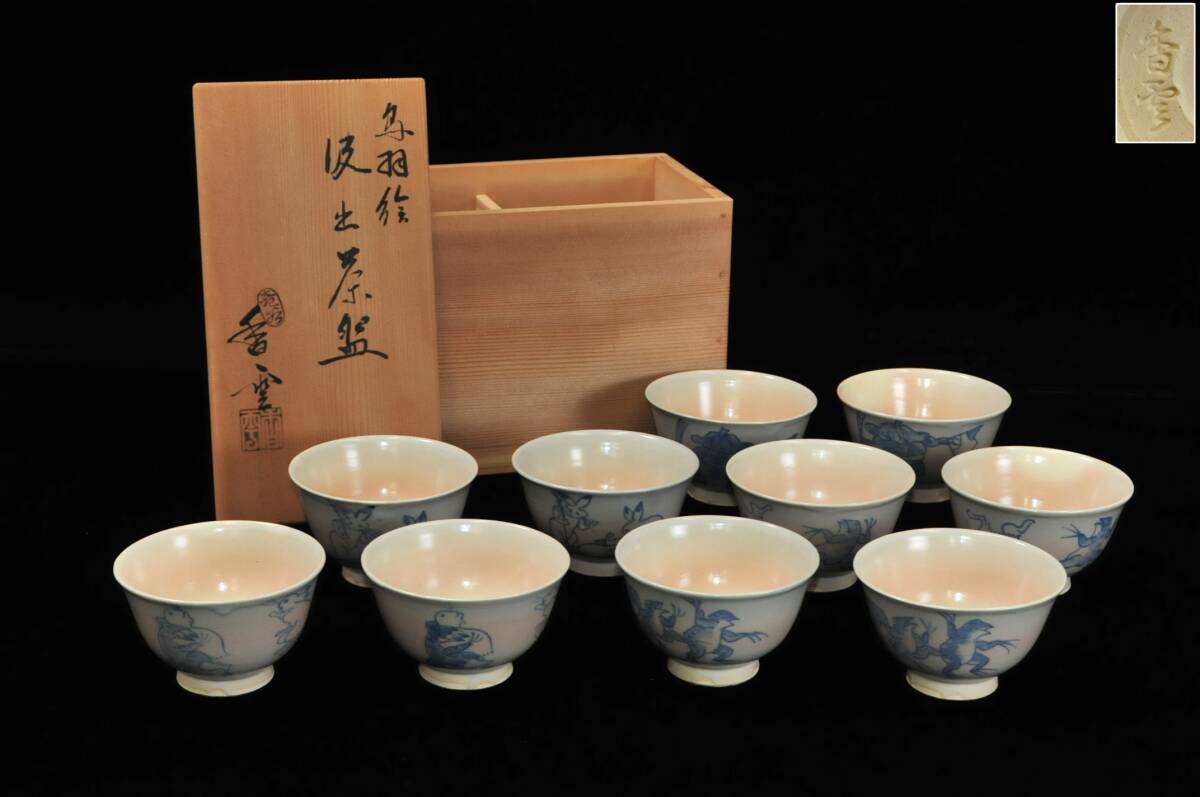 > 【真作】 宮川香雲 鳥羽絵 汲出茶碗 十客絵替り 鳥獣戯画 高山寺 共布共箱 03308016-3
