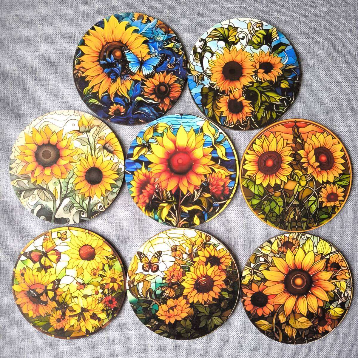 - 【向日葵柄 8枚組 木製コースターセット】木材で作られた飲み物用のコースター 高品質 UV印刷 新品未使用品