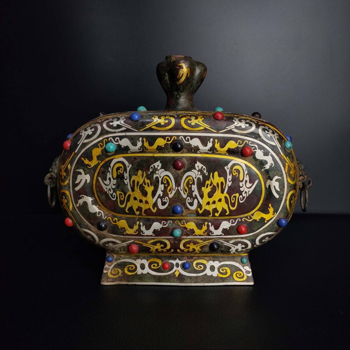 - 蔵友旧蔵出 戦国 青銅作 錯金 錯銀 寶石嵌 扁瓶 希少珍品 貴重品 置物 古賞物 中国古玩 中国古美術品 館蔵品