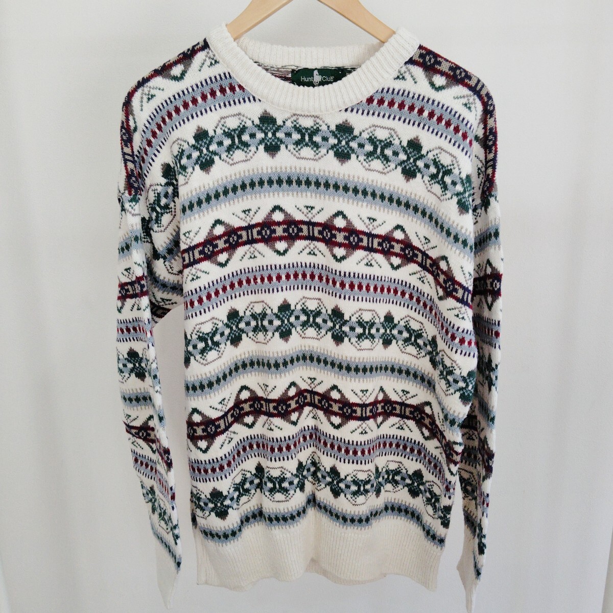 - 0902/L/HuntClub メンズ ニット プルオーバー 総柄 コットン 白
