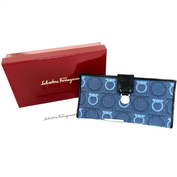 - SD1900 新品未使用! Ferragamo フェラガモ ガンチーニ 二つ折り財布 ロングウォレット キャンバス×レザー ブルー×ブラック ゴールド金具