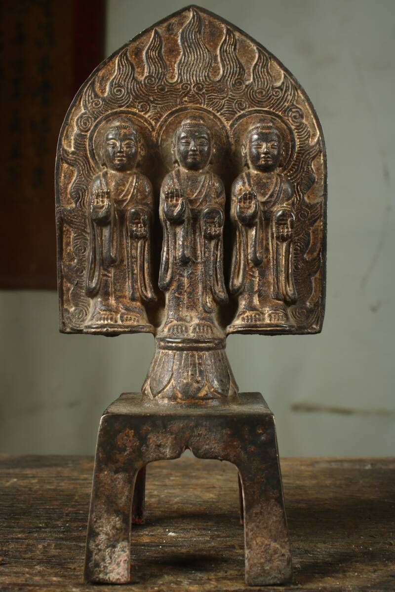 - 明代風 銅泥金 銅器 北魏仏 三宝仏 佛像 仏像 宗教密教 居家供奉 置物 仏教古美術 極細工 骨董 旧家蔵出し 唐物 中国古玩 華夏品 古美術品