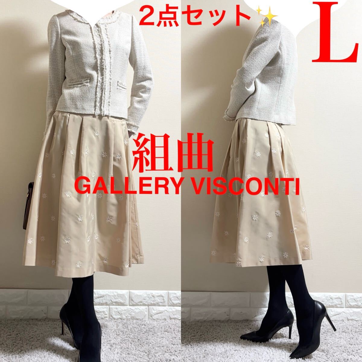> 美品!Lスーツ!組曲 ツイード ノーカラージャケット ギャラリービスコンティ 花柄 刺繍 ロングフレア タフタ スカート ベージュ