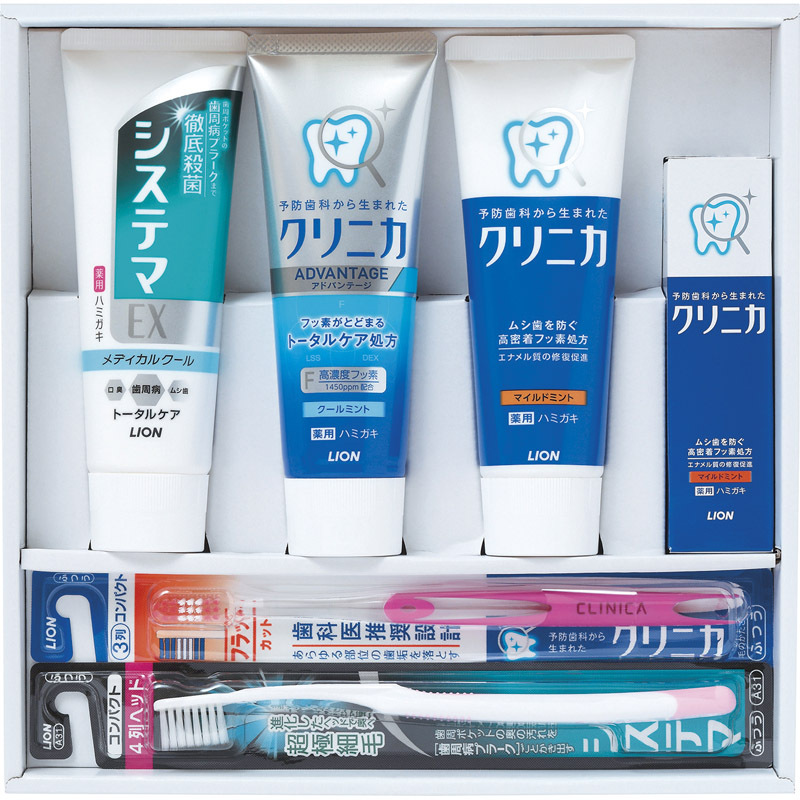 〇注意事項・送料800円が販売価格に含まれています・お取り寄せ商品です。弊社にて手配後、メーカー・卸業者からの直送になります。・まれにメーカー欠品、出荷遅延等が発生致します。問題発生時は別途メールにてご連絡致します。・配送方法の指定、日時指定、置き配、ギフト対応、他商品との同梱配送などは対応できません。・まとめ買いや複数購入の場合は通常より発送に時間が掛かる場合がございます・複数個口の場合、2階以上への搬入ができない場合があります。(その場合は1階での受け渡しとなります)・大型連休、お盆、年末年始などは発送をお休みさせていただく場合がございます・メーカー都合により、パッケージは予告なく変更される場合がございます・梱包用のダンボールはリサイクル品を使用させていただきます。・注文に関するご連絡(注文確定通知・発送通知など)はメールでご案内させていただきます※商品ページの内容について、少しでもご不明な点などがございましたら購入前に一度ご連絡ください〇商品説明あらゆるギフトシーンにおすすめです!すべての人々にめぐりくる日々を、健康で快適に。予防歯科から生まれた「クリニカ」や一歩進んだトータルケアができる薬用歯周病予防ハミガキ「システマEX」などデンタルセットです。〇商品仕様●内容:システマEX(メディカルクール)130g・クリニカアドバンテージ(クールミント)130g・クリニカ(マイルドミント)130g・クリニカ(マイルドミント)30g・システマハブラシ・クリニカハブラシ×各1規格●化粧箱入(246×43×246mm) 656g●加工地:日本(出典:株式会社 八大)